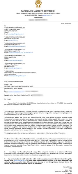 हमारी शिकायत (दिनांक 02/10/2025) में बताया गया था कि राजस्थान के उदयपुर सहित आसपास के जनजातीय क्षेत्रों में गरीब और असहाय परिवारों को मजबूर किया जा रहा है कि वे सिर्फ ₹20,000 – ₹45,000 के बदले अपने 8 से 12 वर्ष के बच्चों को गड़रियों को गिरवी या स्थायी रूप से बेच दें।