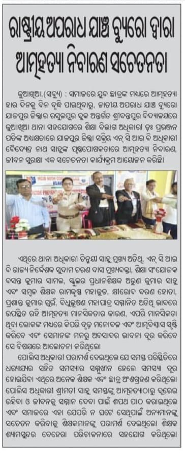 उड़ीसा के जाजपुर ज़िले स्थित श्रीबंतपुर विद्यालय में राष्ट्रीय अपराध जांच ब्यूरो (NCIB) द्वारा “आत्महत्या रोकथाम, जीवन संरक्षण” विषय पर एक जागरूकता कार्यक्रम का आयोजन किया गया। इस कार्यक्रम का उद्देश्य विद्यार्थियों और शिक्षकों में जीवन के प्रति सकारात्मक सोच विकसित करना और आत्महत्या जैसी गंभीर प्रवृत्तियों को रोकने के लिए समाज को संवेदनशील बनाना था।